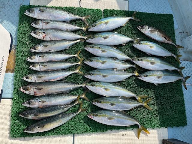 釣果 ハマチ11匹、大サバ11匹、鬼アジ1匹でした。